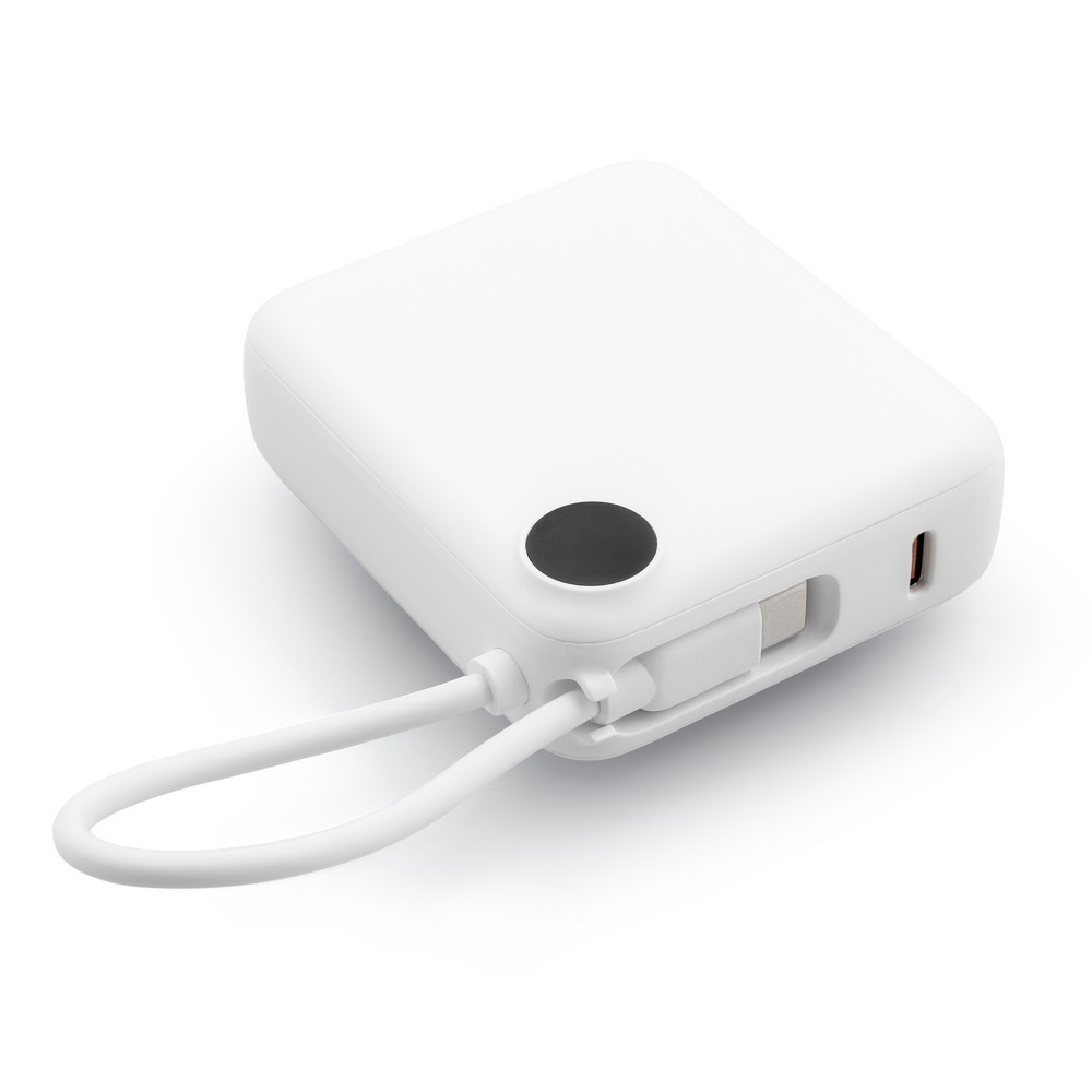 Power bank 10000 mAh z ładowaniem 20W, wyposażony w kabel z haczykiem ułatwiającym przypięcie, miniaturowy rozmiar pozwalający na wygodne przenoszenie
