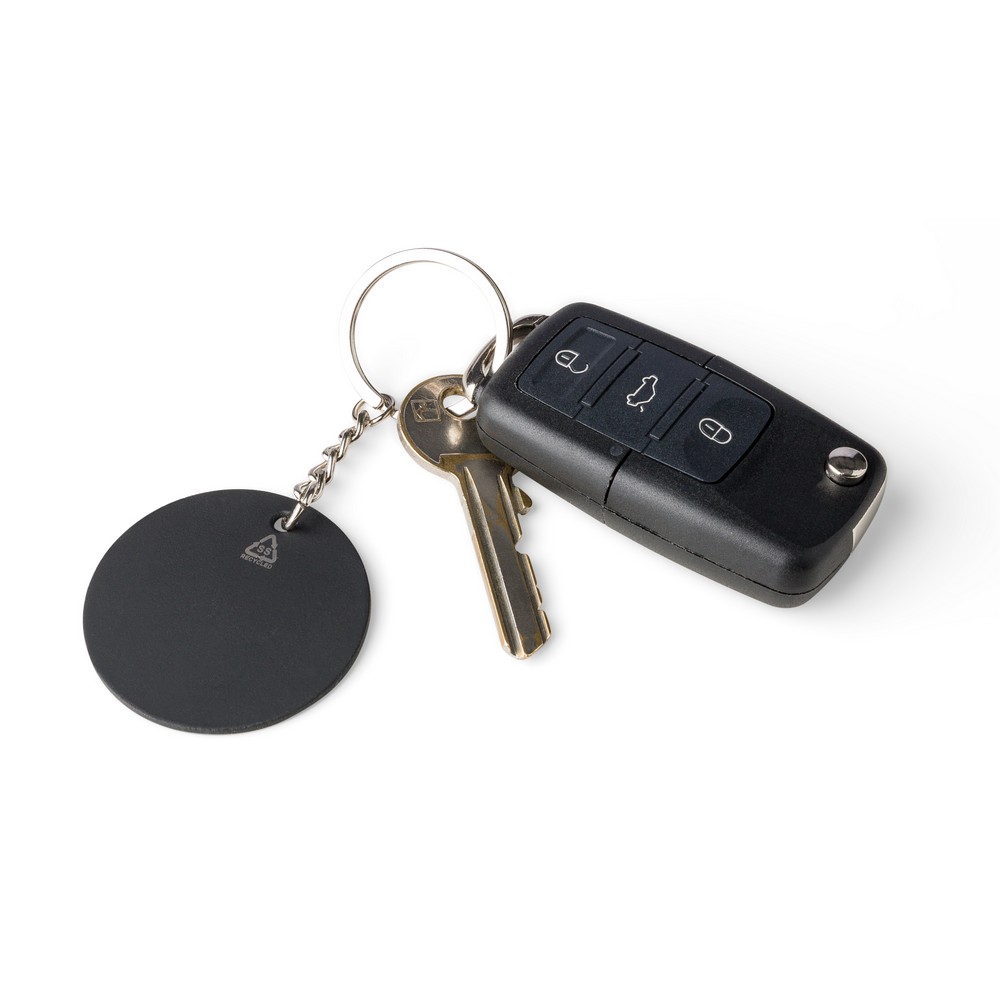 Prostokątny brelok do kluczy, ikona recyklingu na produkcie, zapakowany w kraftową kopertę, produkt wykonany ze stali nierdzewnej z recyklingu