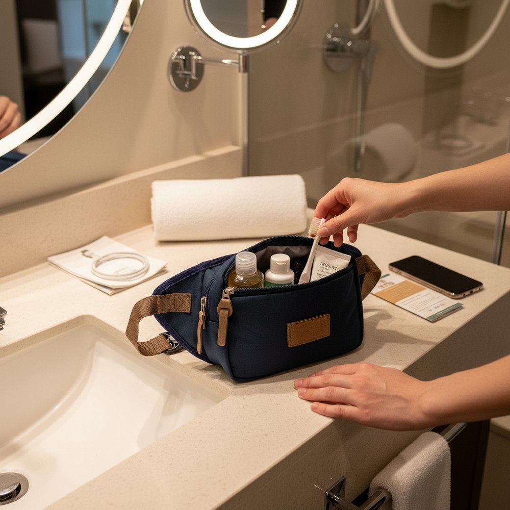 Saszetka zapinana w pasie B'RIGHT, zgodna z certyfikatem GRS (Global RecycIed Standard), wykonana z RPET, przegroda główna oraz przednia kieszeń na zamek błyskawiczny, wewnątrz kieszeń siateczkowa na zamek błyskawiczny, wnętrze wykończone podszewką w kolorze regulowanego paska biodrowego, zapięcie na klamrę, min. obwód ok. 63 cm, max. obwód ok. 109 cm