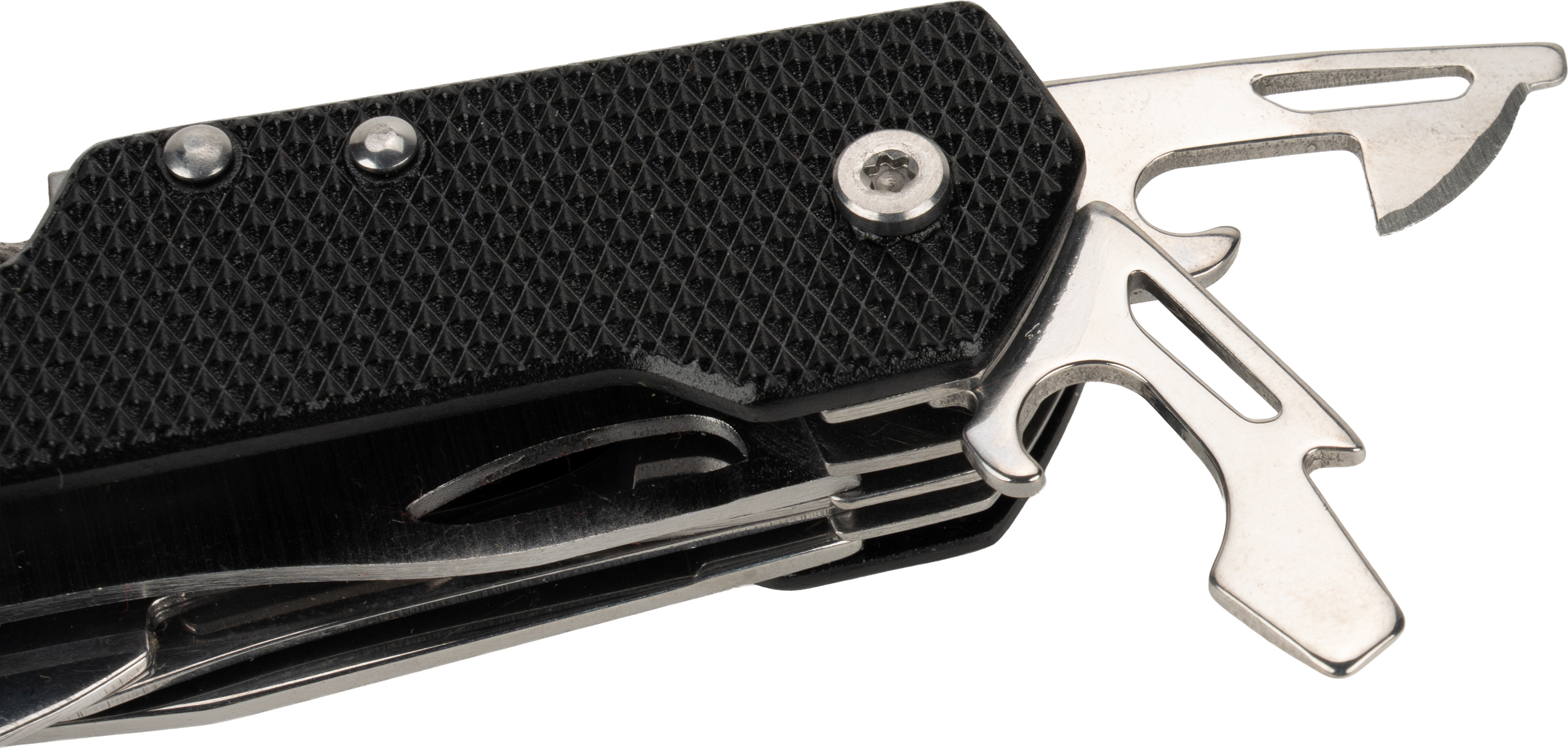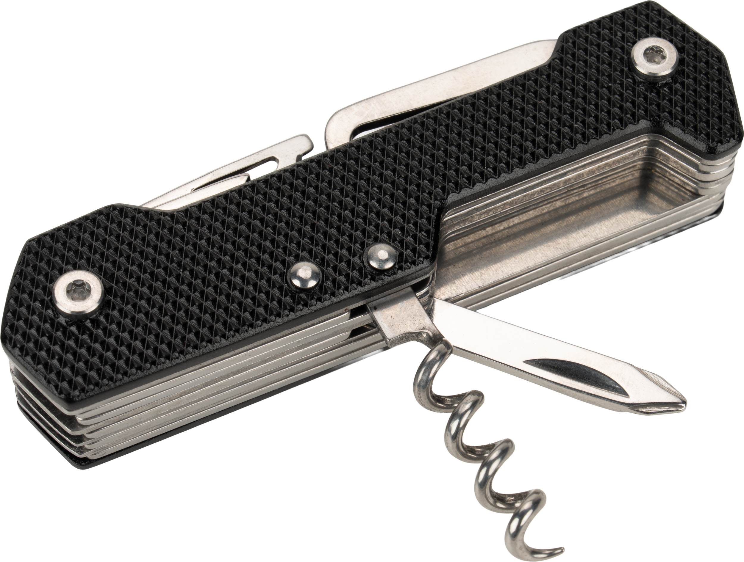 Wielofunkcyjny scyzoryk, posiadający 9 przydatnych narzędzi - nóż, nożyczki, piła, korkociąg, otwieracz do butelek, otwieracz do konserw, płaski śrubokręt, śrubokręt phillips i karabińczyk.