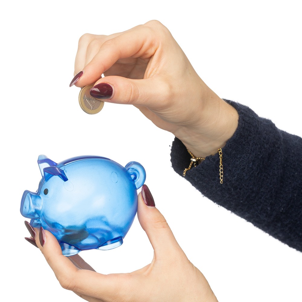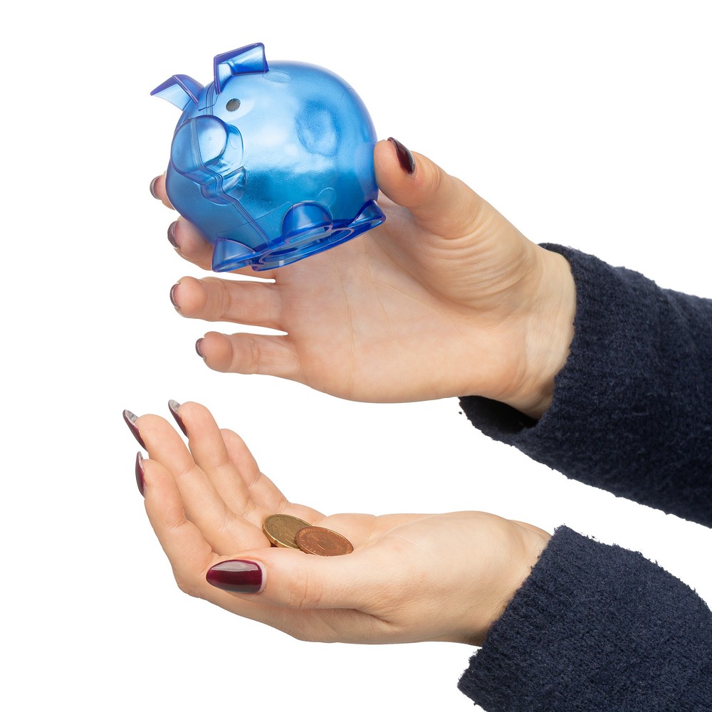 Skarbonka "świnka", ikona recyklingu na produkcie, zapakowany w woreczek foliowy z recyklingu, produkt wykonany z plastiku z recyklingu