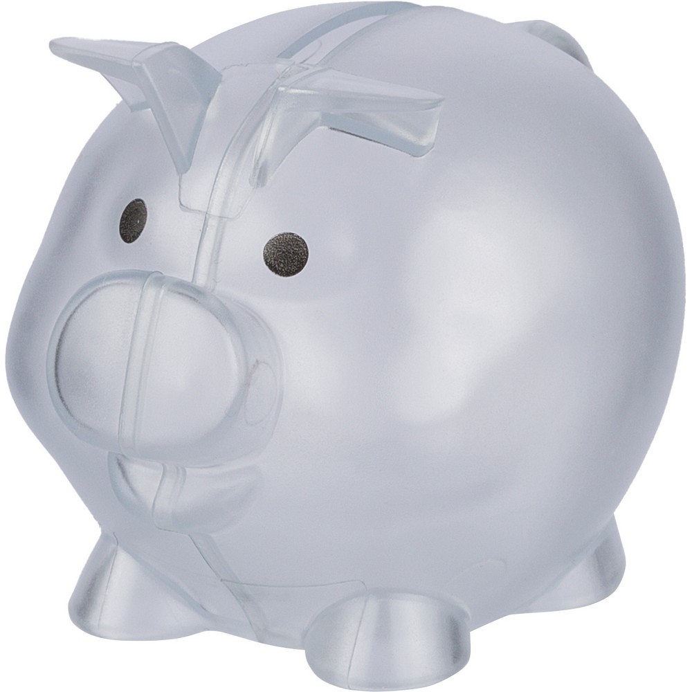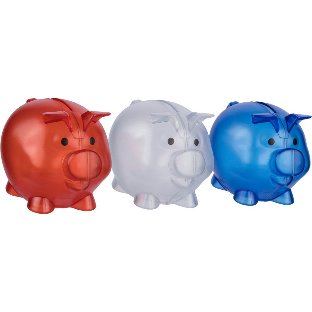 Skarbonka "świnka", ikona recyklingu na produkcie, zapakowany w woreczek foliowy z recyklingu, produkt wykonany z plastiku z recyklingu
