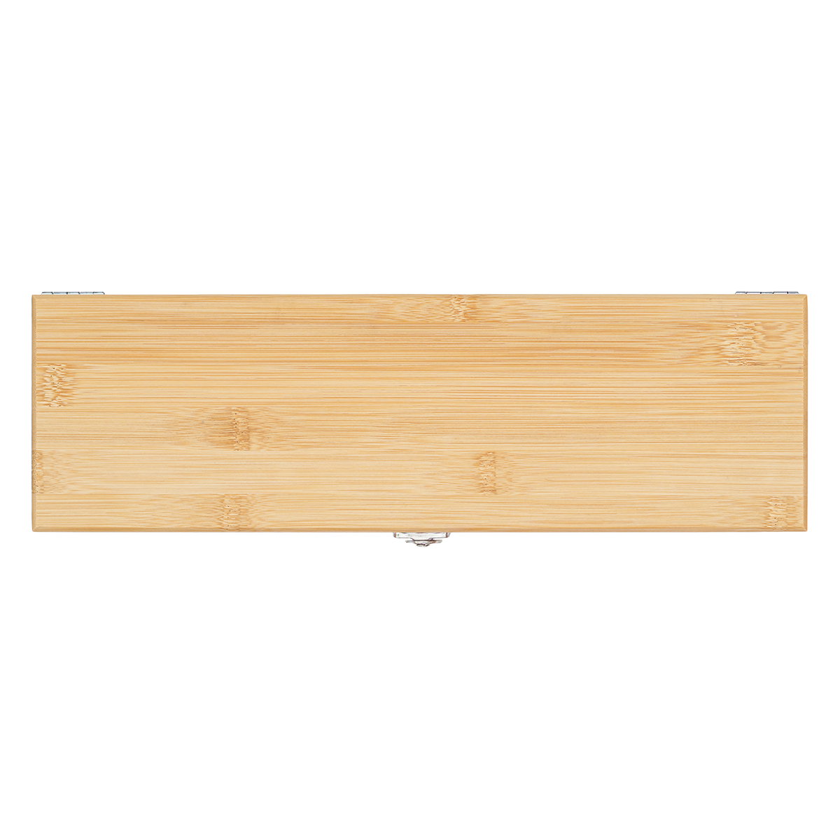 Bambusowa skrzynka na wino wyściełana tkaniną. W zestawie znajdują się także: nóż kelnerski, pierścień na butelkę (okapnik), zatyczka, nalewak z zamknięciem.