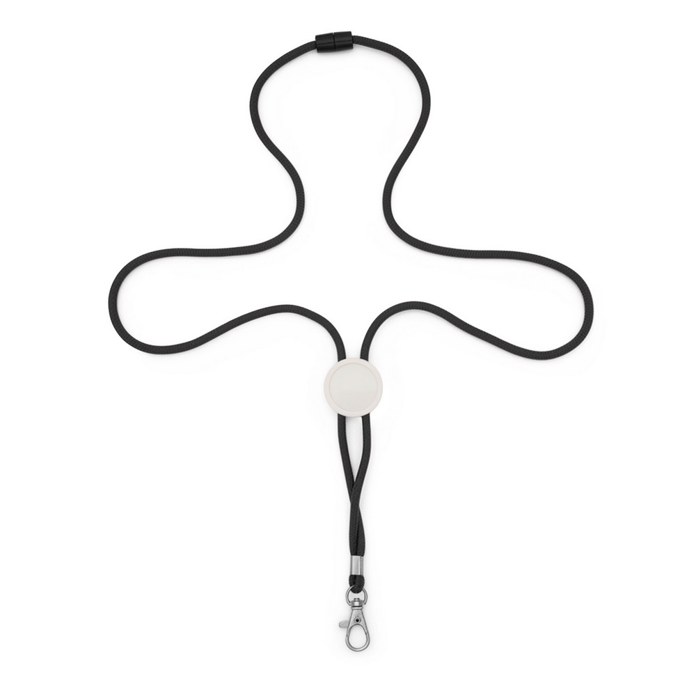 Smycz reklamowa wykonana z poliestru, elastyczny sznurek z suwakiem do regulacji długości, metalowy karabińczyk do przypinania, okrągły element przeznaczony pod znakowanie