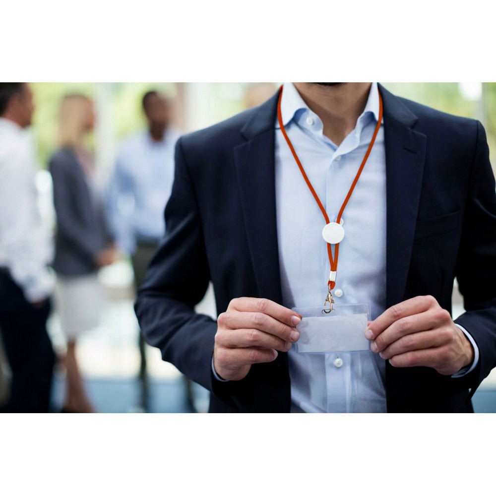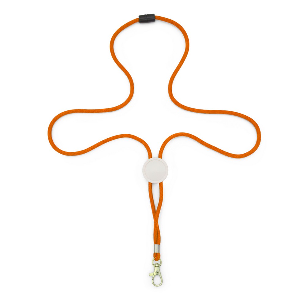 Smycz reklamowa wykonana z poliestru, elastyczny sznurek z suwakiem do regulacji długości, metalowy karabińczyk do przypinania, okrągły element przeznaczony pod znakowanie
