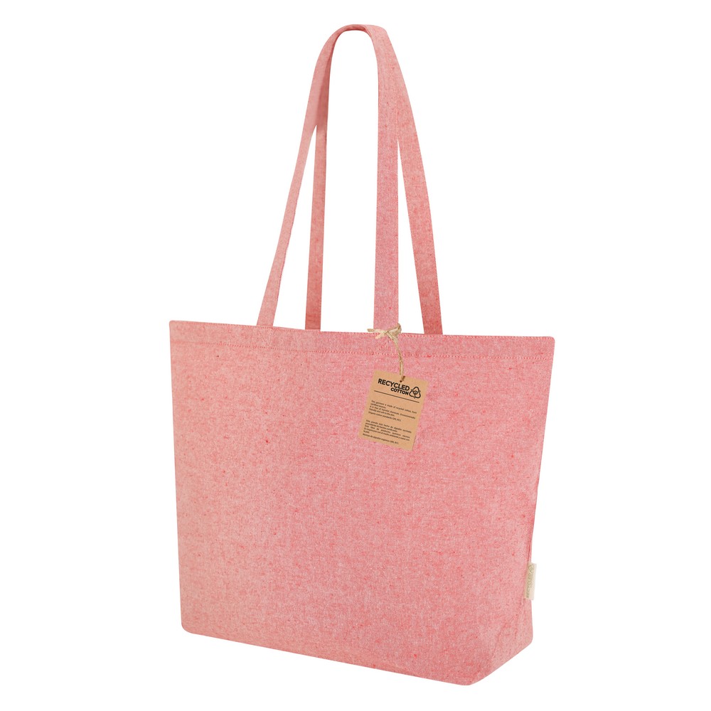 Torba na zakupy, posiada długie uchwyty umożliwiające noszenie na ramieniu, produkt wykonany z bawełny z recyklingu 220 g/m2