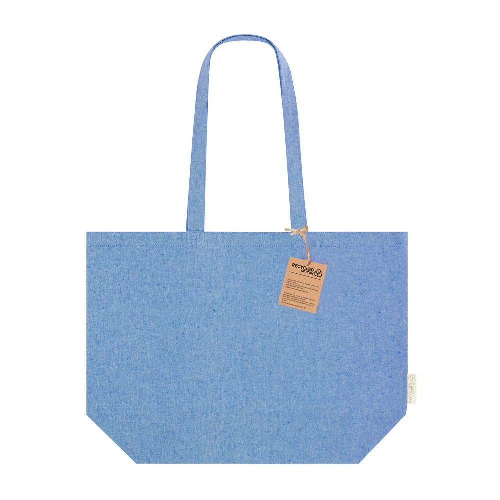 Torba na zakupy, posiada długie uchwyty umożliwiające noszenie na ramieniu, produkt wykonany z bawełny z recyklingu 220 g/m2