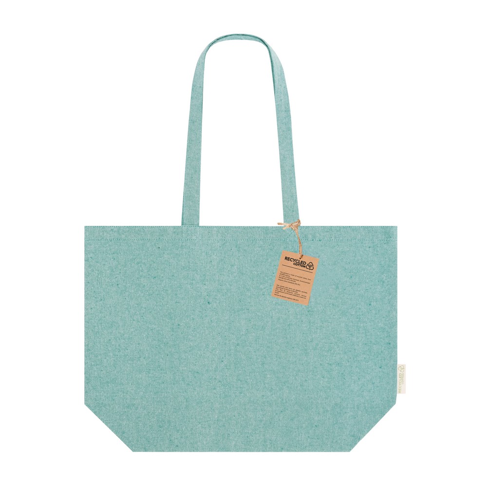 Torba na zakupy, posiada długie uchwyty umożliwiające noszenie na ramieniu, produkt wykonany z bawełny z recyklingu 220 g/m2