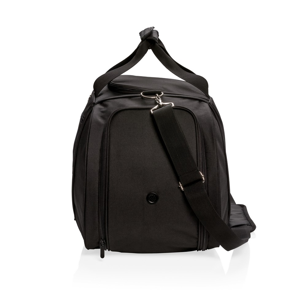 Torba sportowa, podróżna, wykonana z poliestrów 600D i 1680D, pojemna główna przegroda z zamknięciem w kształcie litery U na górze, boczna kieszeń na buty z otworami wentylacyjnymi, przednia kieszeń na zamek błyskawiczny na drobne akcesoria, podwójne uchwyty, regulowany pasek na ramię, nie zawiera PVC, ślad węglowy produktu: 8,44 kg CO2