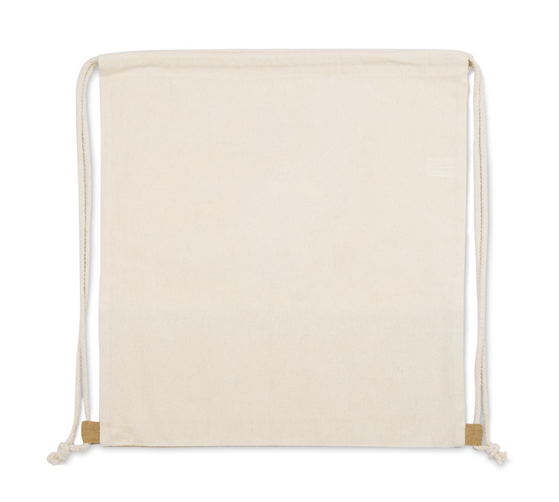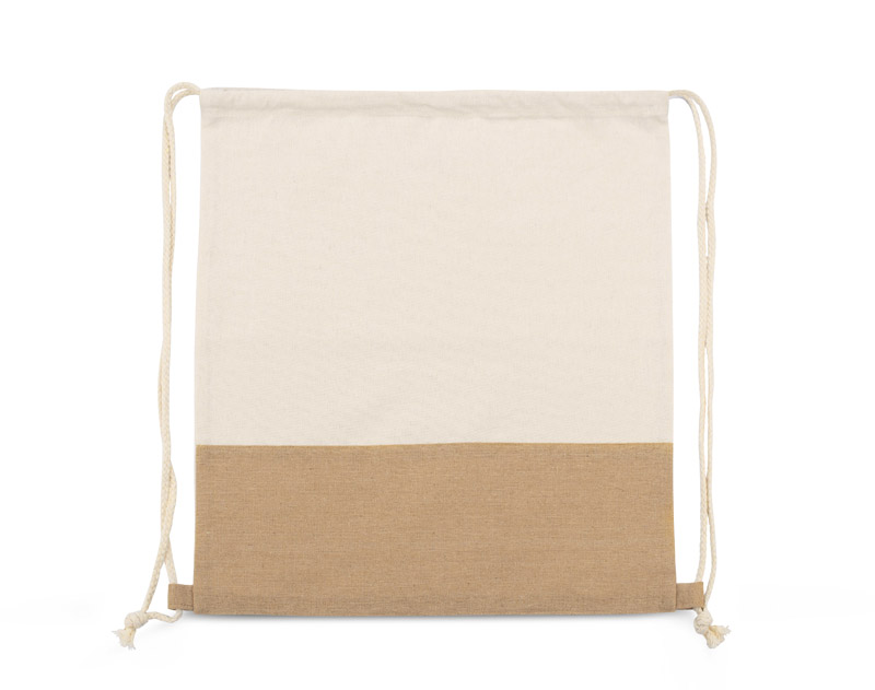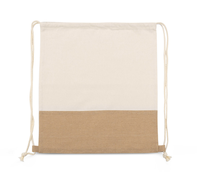 Worek JUTIK wykonany jest z bawełny (160g/m2) połączonej z materiałem podobnym do juty. Całość wygląda bardzo naturalnie i ciekawie. Worek jest jednokomorowy, zaciągany na bawełniane sznureczki.