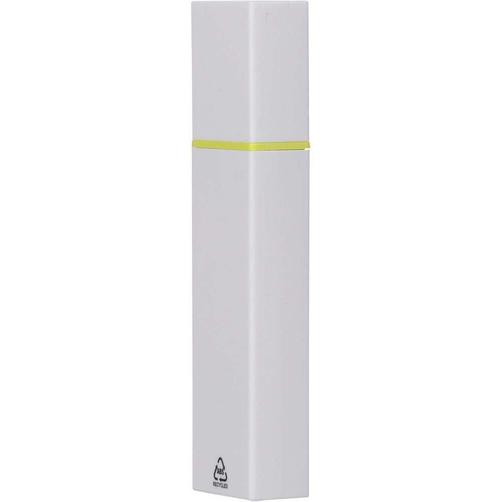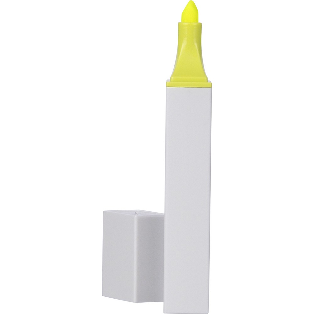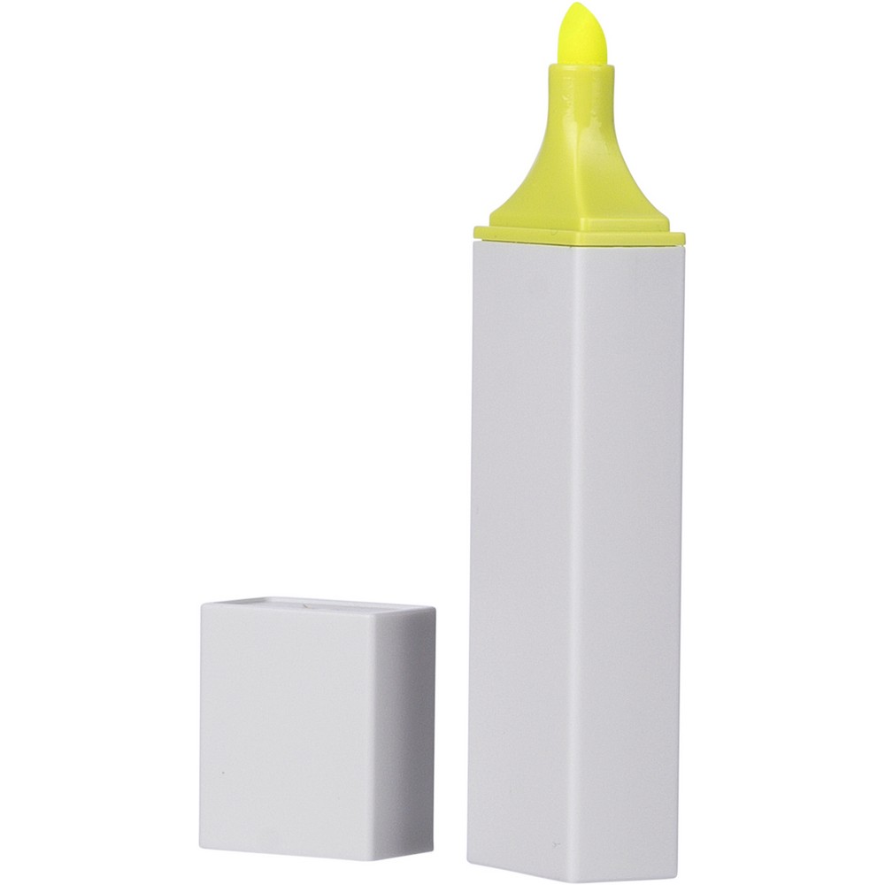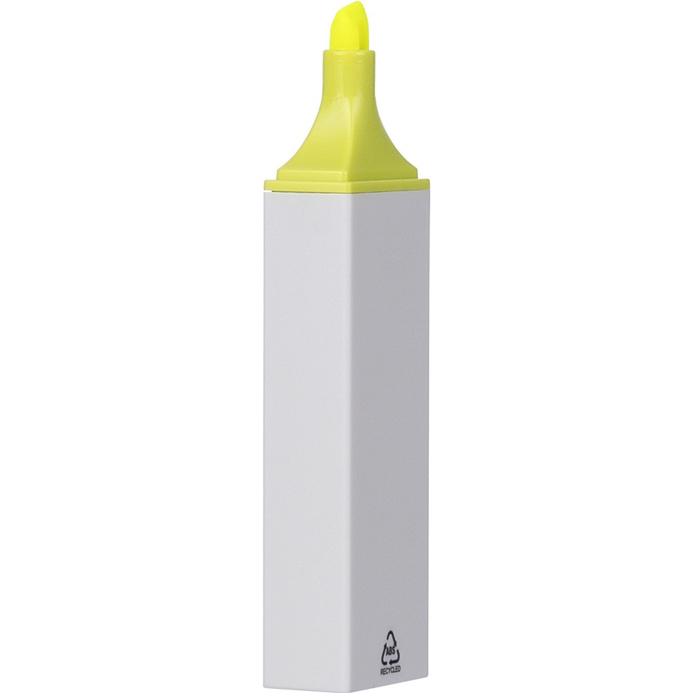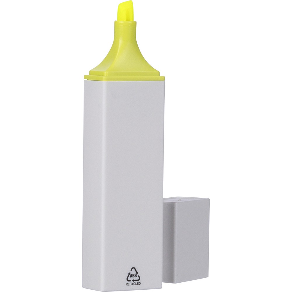 Zakreślacz, biała obudowa, kolorowy detal, zawiera ikonę ABS na produkcie, produkt wykonany z ABS z recyklingu