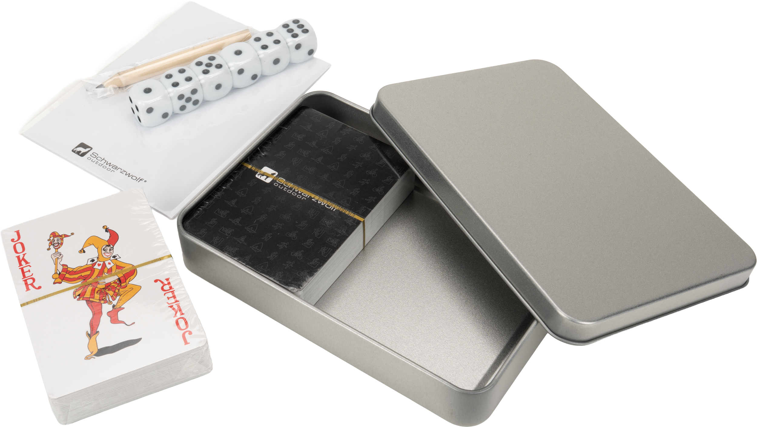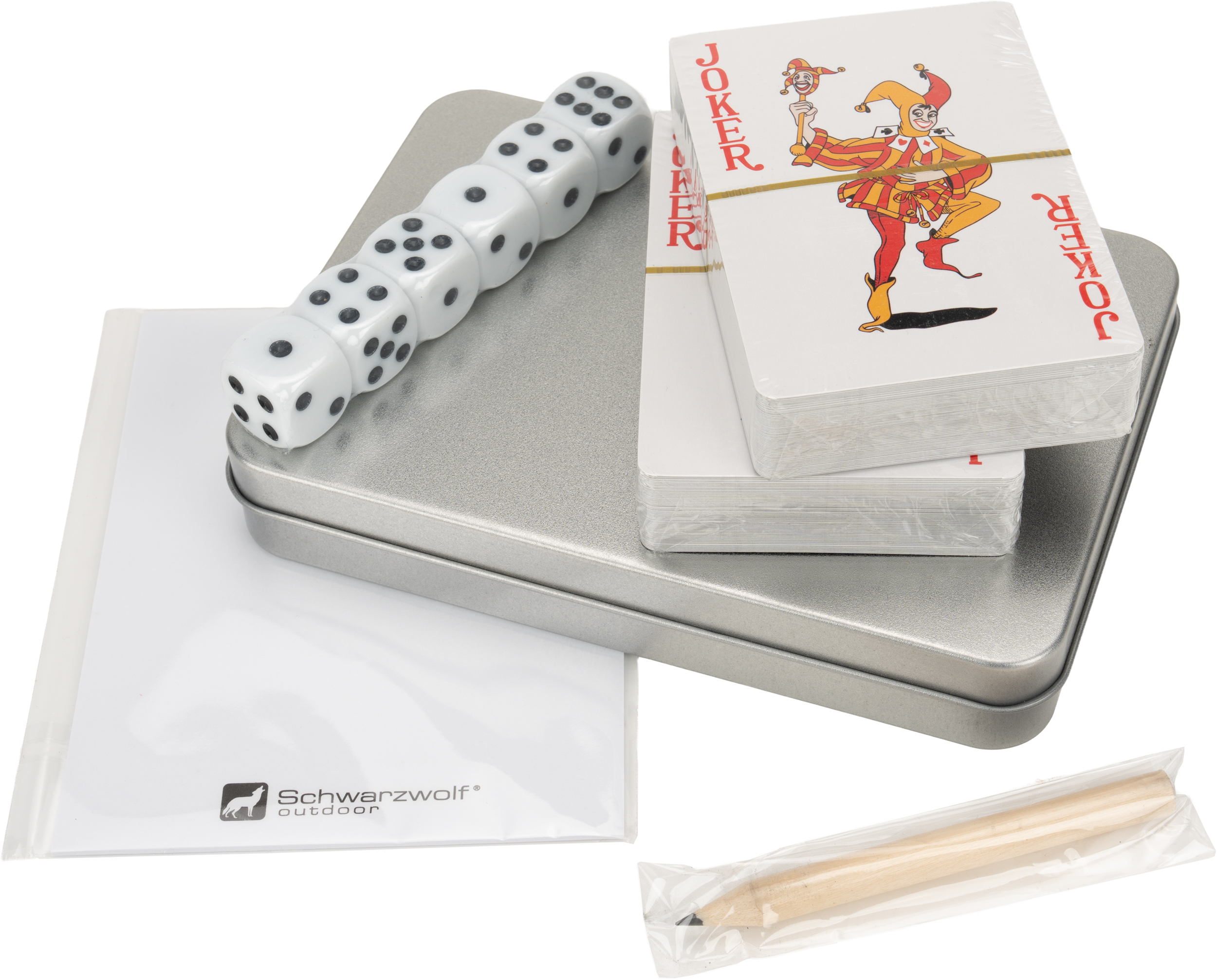 Zestaw podróżny do gry w karty i kości, zapakowany w blaszane pudełko. Zestaw składa się z 2 talii 54 kart z wodoodporną powierzchnią, 6 kości do gry i 15 karteczek do notowania oraz ołówek.