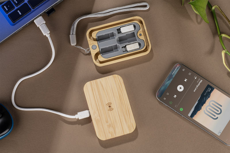 Zestaw kabli BUMO to praktyczne i wielofunkcyjne akcesorium do ładowania, umieszczone w estetycznym etui z bambusa. Oprócz klasycznych kabli, zestaw wyposażono w funkcję ładowarki bezprzewodowej w standardzie Qi Wireless o mocy 10 W, co pozwala wygodnie zasilać kompatybilne urządzenia. Kable wykonane z tworzywa ze słomy pszennej oferują zarówno funkcję ładowania, jak i obsługę przesyłu danych, a wyjście o mocy do 15 W zapewnia szybkie działanie. Dzięki złączom USB-C zestaw sprawdzi się w przypadku większości nowoczesnych urządzeń mobilnych. Kompaktowe etui ułatwia przechowywanie i transport, dzięki czemu BUMO idealnie nadaje się do codziennego użytku w biurze i w podróży. Możliwość znakowania sprawia, że to również ciekawy gadżet reklamowy z praktycznym zastosowaniem.