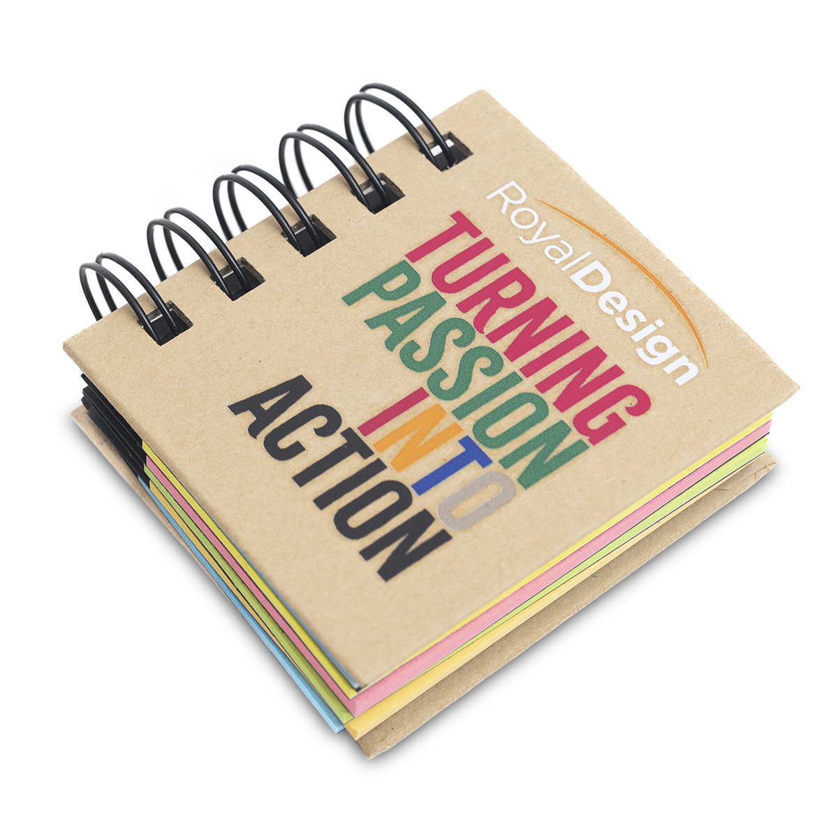 Zestaw składający się z karteczek memo o różnych kolorach w kartonowej oprawie (gramatura kartonu 1250 g). Karteczki memo w pięciu kolorach po 25 szt. w rozmiarze 5x7,5 cm. Gramatura 80g/m2.
