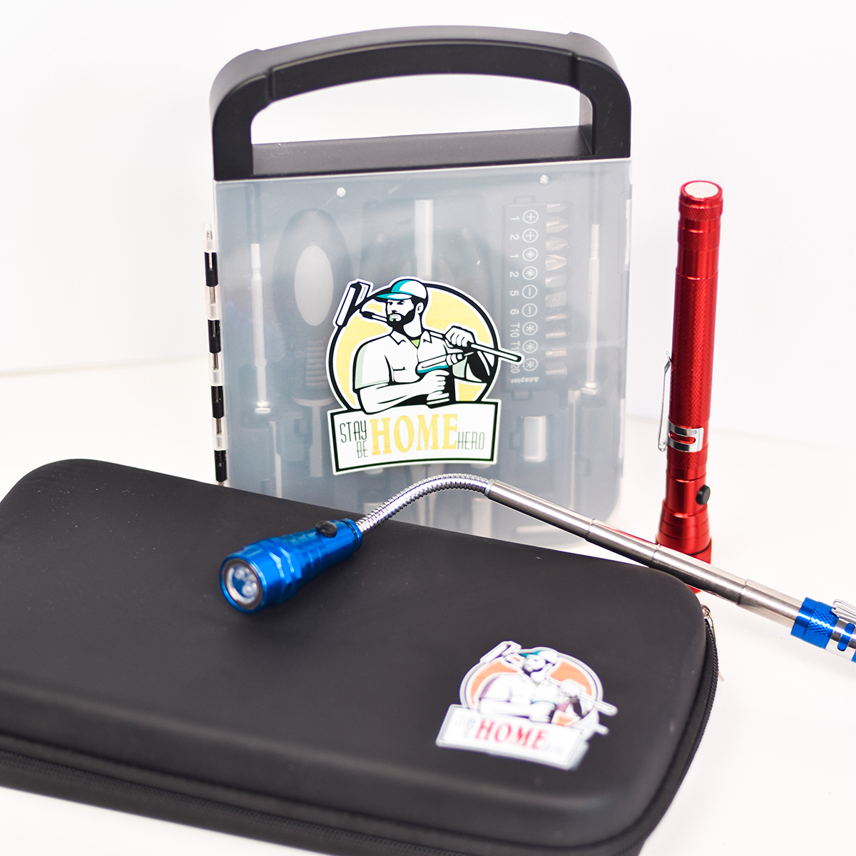 Zestaw narzędzi w etui zapinanym na zamek. Zestaw składa się z: młotka, poziomicy, nożyka introligatorskiego, zwijanej 3,5 m miarki wyposażonej w mechanizm blokujący oraz szczypiec długich, szczypiec z przegubem ślizgowym, płaskiego śrubokręta i śrubokręta krzyżakowego. Podziałka w centymetrach i calach.