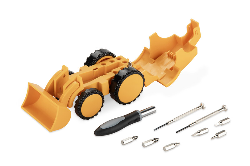 Zestaw narzędzi DREX to praktyczny gadżet ukryty w nietypowej formie koparki. Po otwarciu obudowy wnętrze skrywa zestaw bitów, klasyczny śrubokręt oraz dwa śrubokręty precyzyjne, przydatne przy drobnych naprawach. Kompaktowa konstrukcja sprawia, że wszystkie elementy są dobrze uporządkowane i zawsze pod ręką. Funkcjonalność połączona z oryginalnym wyglądem sprawia, że DREX może być ciekawym upominkiem promocyjnym, szczególnie dla branży budowlanej i technicznej. Dzięki możliwości znakowania logo staje się także praktycznym nośnikiem reklamy.