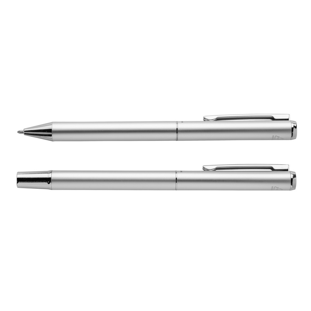 Zestaw piśmienny, długopis i pióro kulkowe, długopis posiada wkład Dokumental® w kolorze niebieskim, długość pisania ok. 1200 m, długopis i pióro kulkowe posiadają wkład Dokumental® w kolorze niebieskim, długość pisania długopisu ok. 1200 m, pióra kulkowego ok. 400 m, wykonane z aluminium z recyklingu z certyfikatem RCS, całkowita zawartość materiałów z recyklingu obliczona na podstawie wagi całkowitej przedmiotu: 17%, ślad węglowy produktu: 0,25 kg CO2
