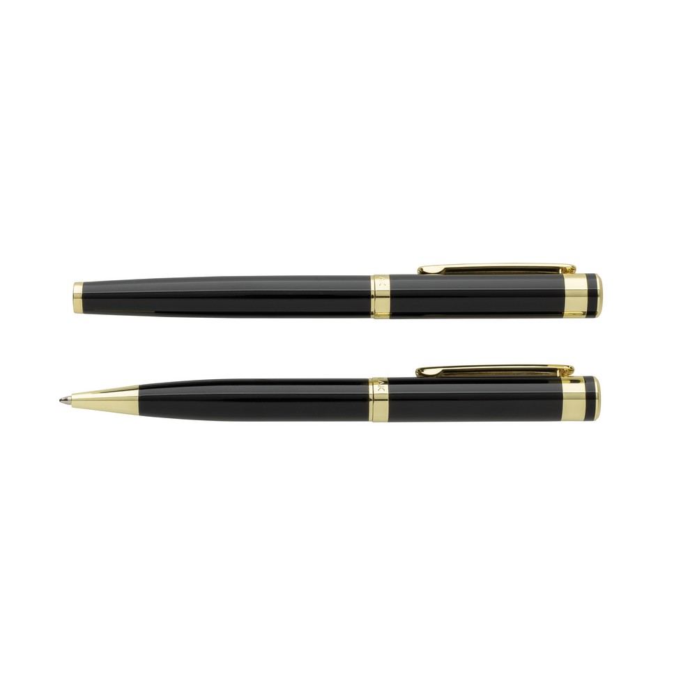 Ekskluzywny zestaw piśmienny, pióro żelowe oraz długopis z logotypem Swiss Peak wykonane z mosiądzu z recyklingu z certyfikatem RCS, akcenty w kolorze złotym, niebieski wkład, długość pisania długopisu ok. 1200 m, długość pisania pióra ok. 800 m, pudełko podarunkowe w komplecie, całkowita zawartość materiałów z recyklingu obliczona w oparciu o wagę całkowitą przedmiotu: 55%