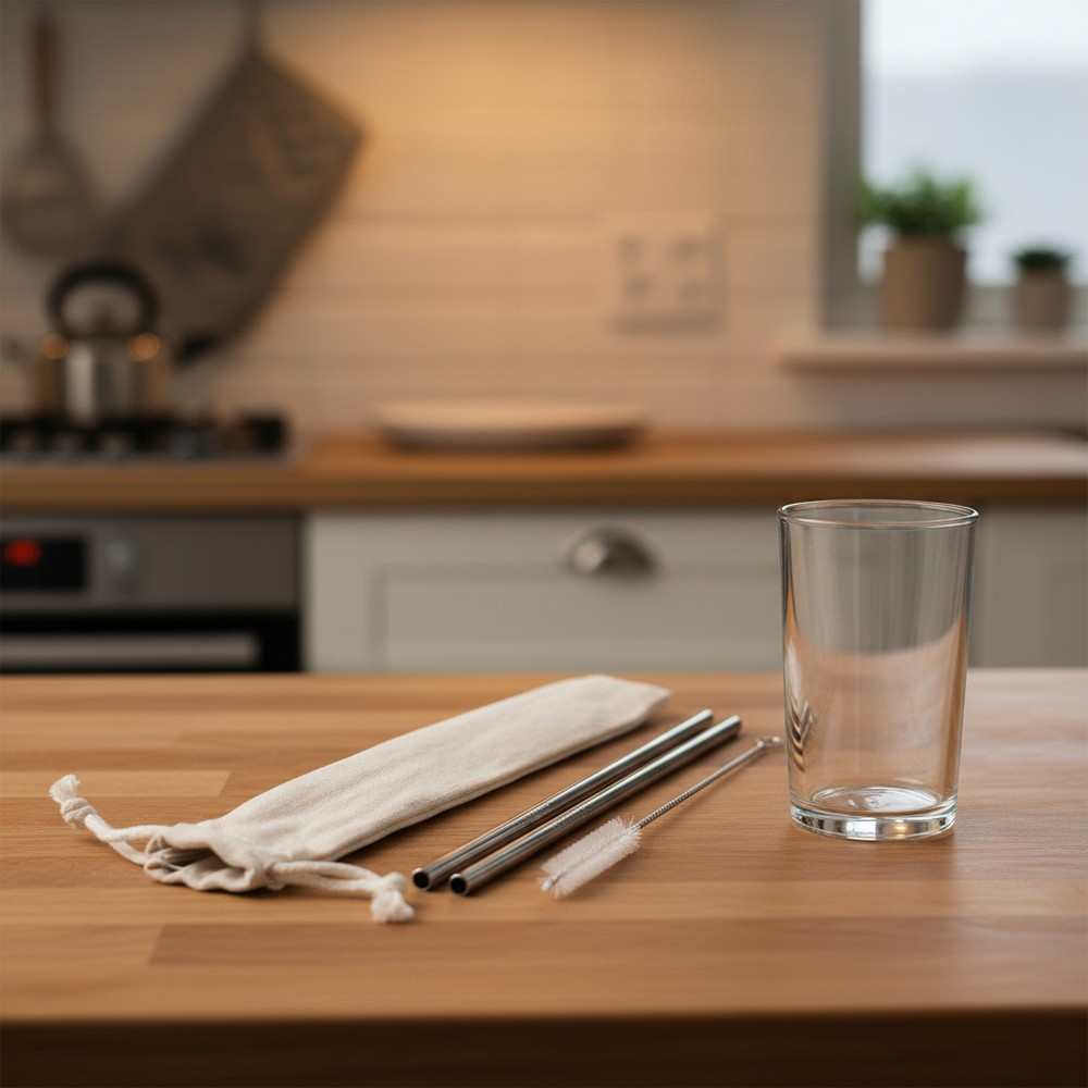 Zestaw 2 słomek wielokrotnego użytku, czyścik i bawełniany woreczek w komplecie, produkt wykonany ze stali nierdzewnej i bawełny