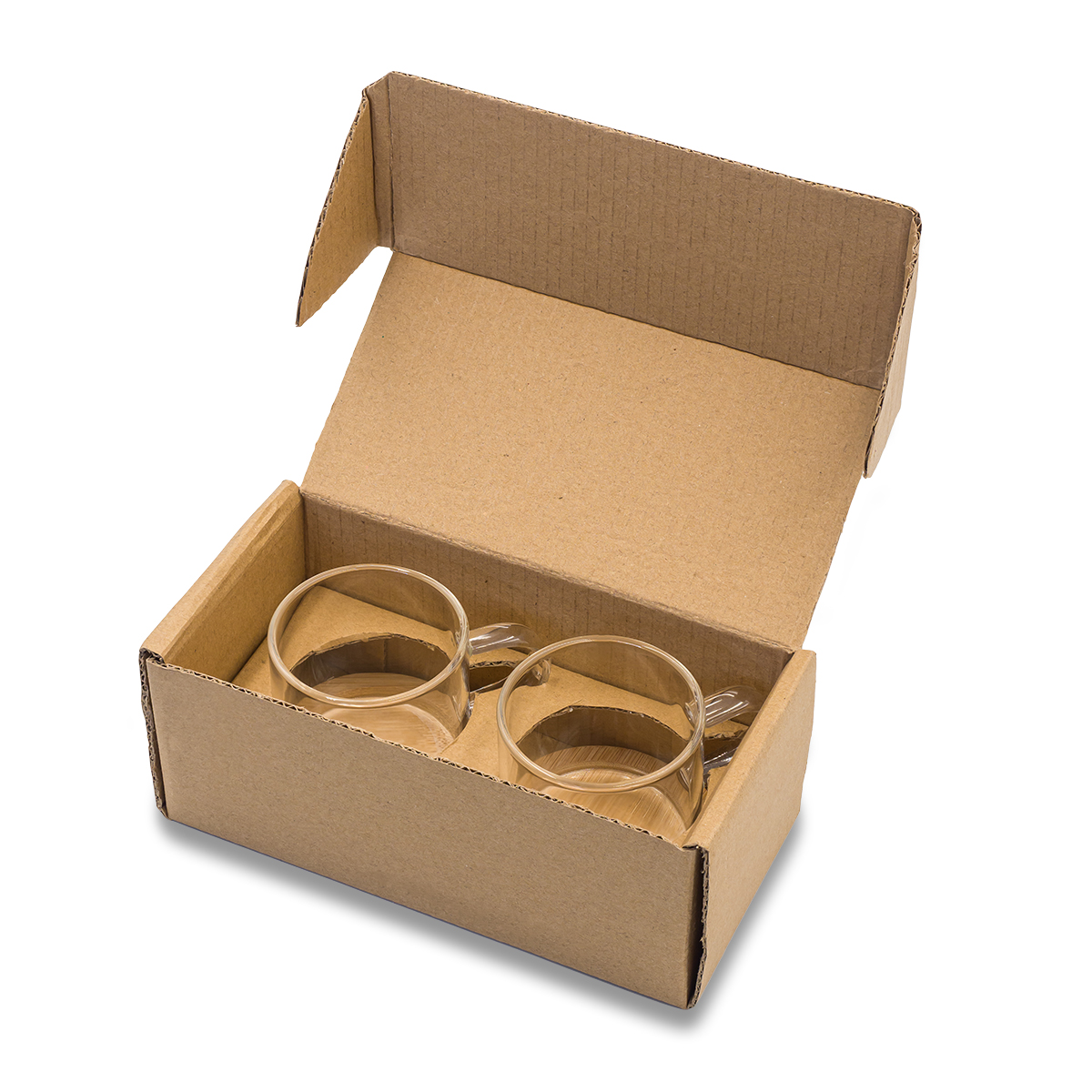 Zestaw 2 szklanek do kawy ze szkła borokrzemowego, z bambusowymi podstawkami. Pojemność filiżanki 125 ml.