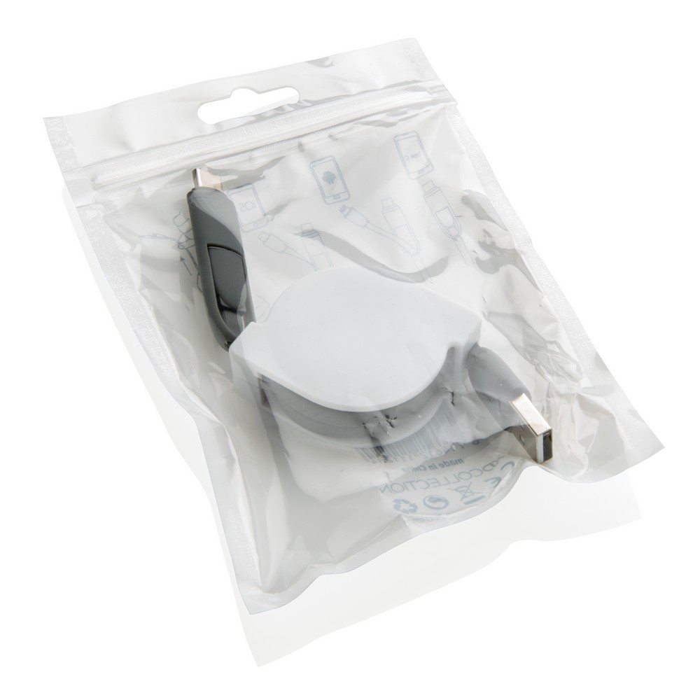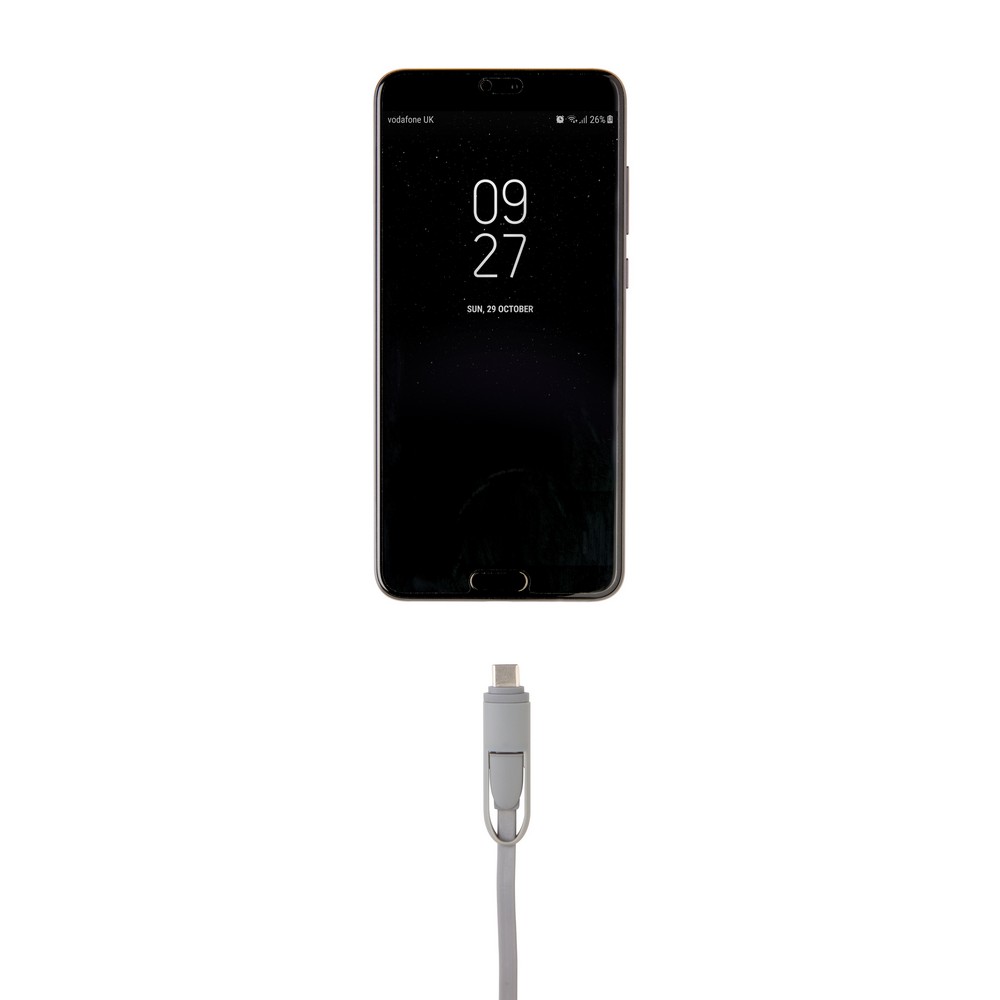 Zwijany, płaski kabel do ładowania i synchronizacji 3 w 1 z końcówkami: USB, typu C i 2 w 1 (micro USB oraz kompatybilną z urządzeniami iOS), obudowa wykonana z ABS, kabel z TPU, długość po rozwinięciu 1 m, ślad węglowy produktu: 0,29 kg CO2